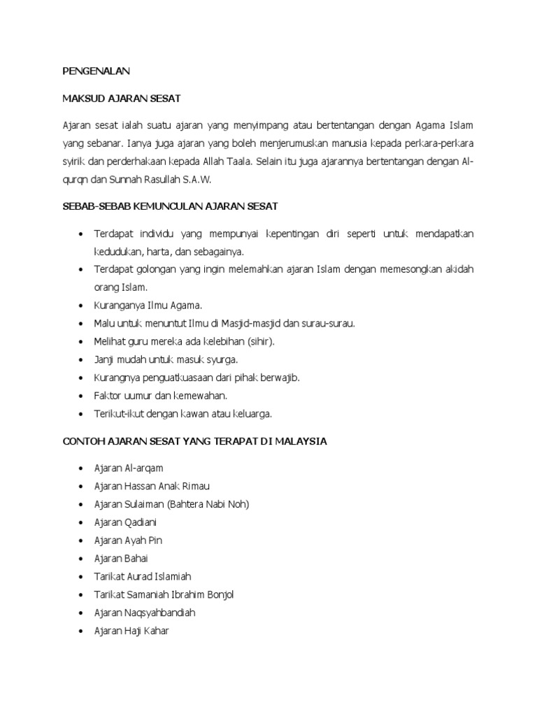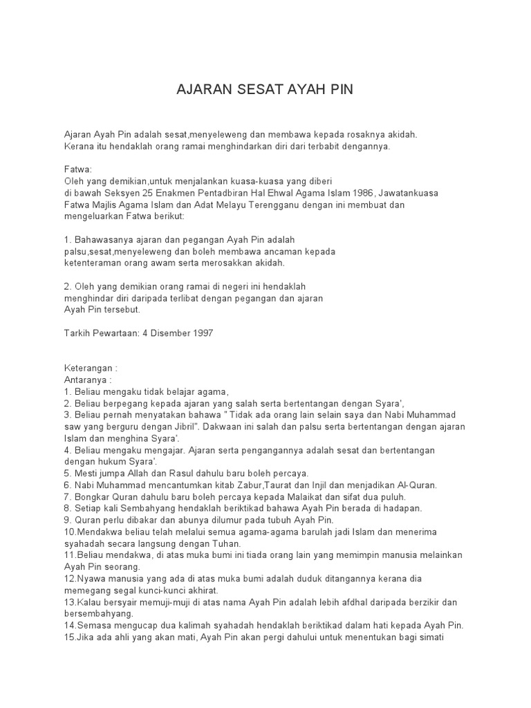 Ritual seperti itu tidak dibenarkan karena idak sesuai dengan ajaran rosulullah, kata sekretaris mui pandeglang, abdul ghaffar. Salah satu ajaran sesat yang paling terkenal suatu ketika dahulu, iaitu ajaran ayah pin. Ajaran sesat datang dalam berbagai sifat dan ciri, ikuti video ini untuk mengetahui tentang 5 ajaran sesat yang pernah. Ia antara lain, mengamalkan ratib secara kuat dalam gelap dengan bercampur antara lelaki dan wanita. Quotayah pin didakwa tuhan semua agamaquot ajaran sesat kerajaan langit.